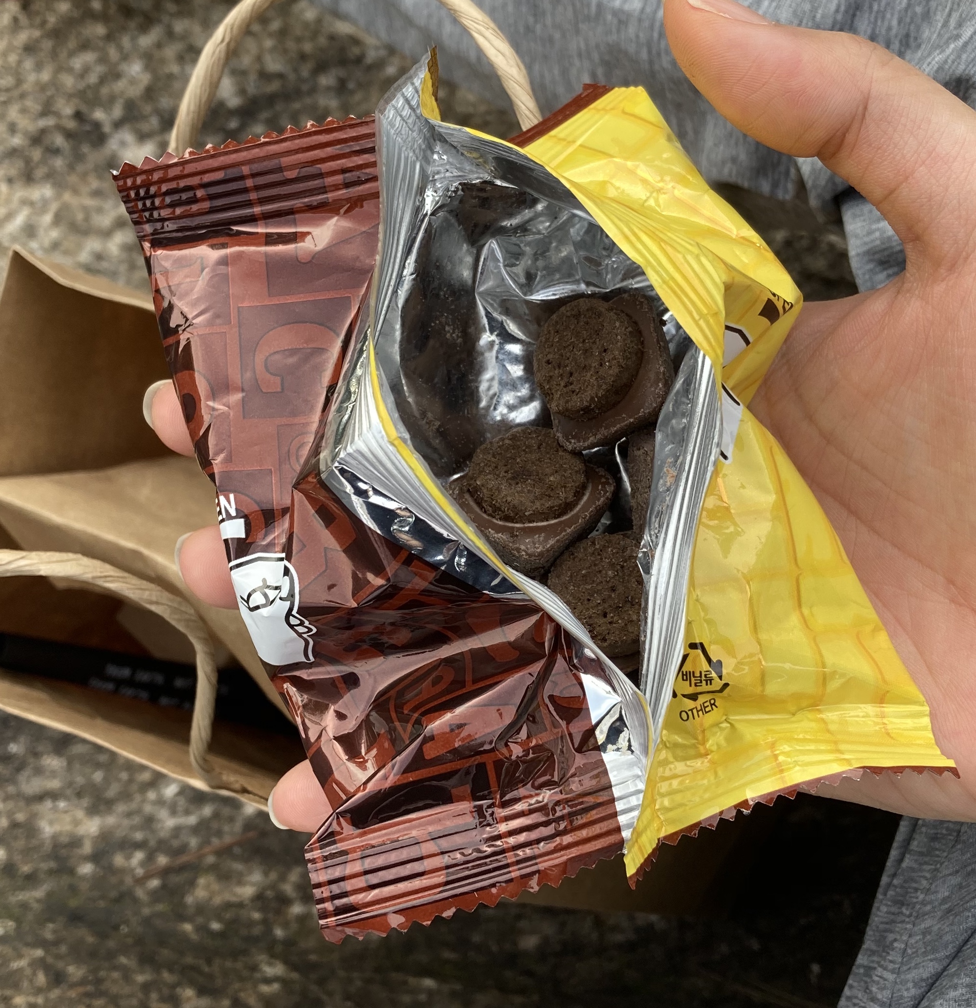 중간에 바위에 앉아서 까먹은 ABC초콜릿 쿠키.