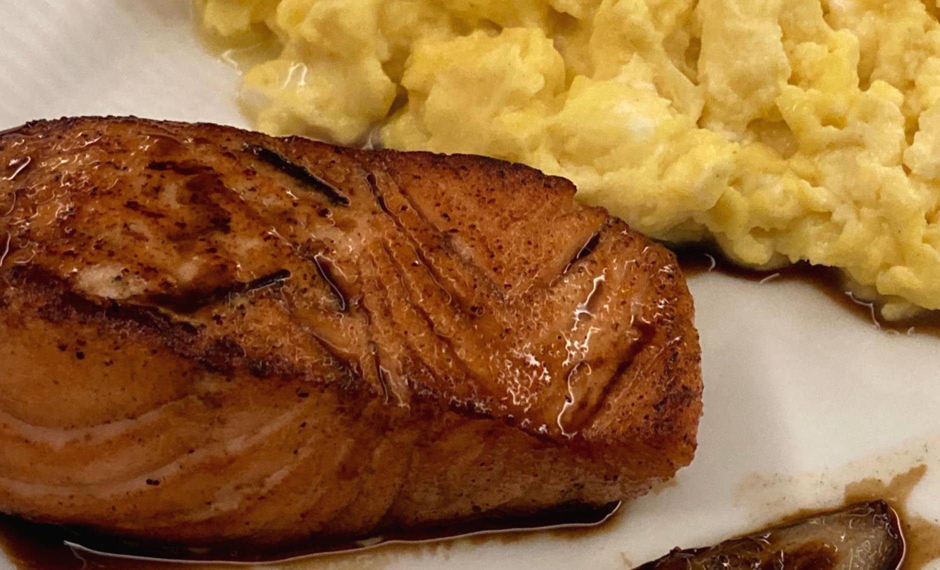 방금 전 아침으로 먹은 스크램블에그와 연어스테이크