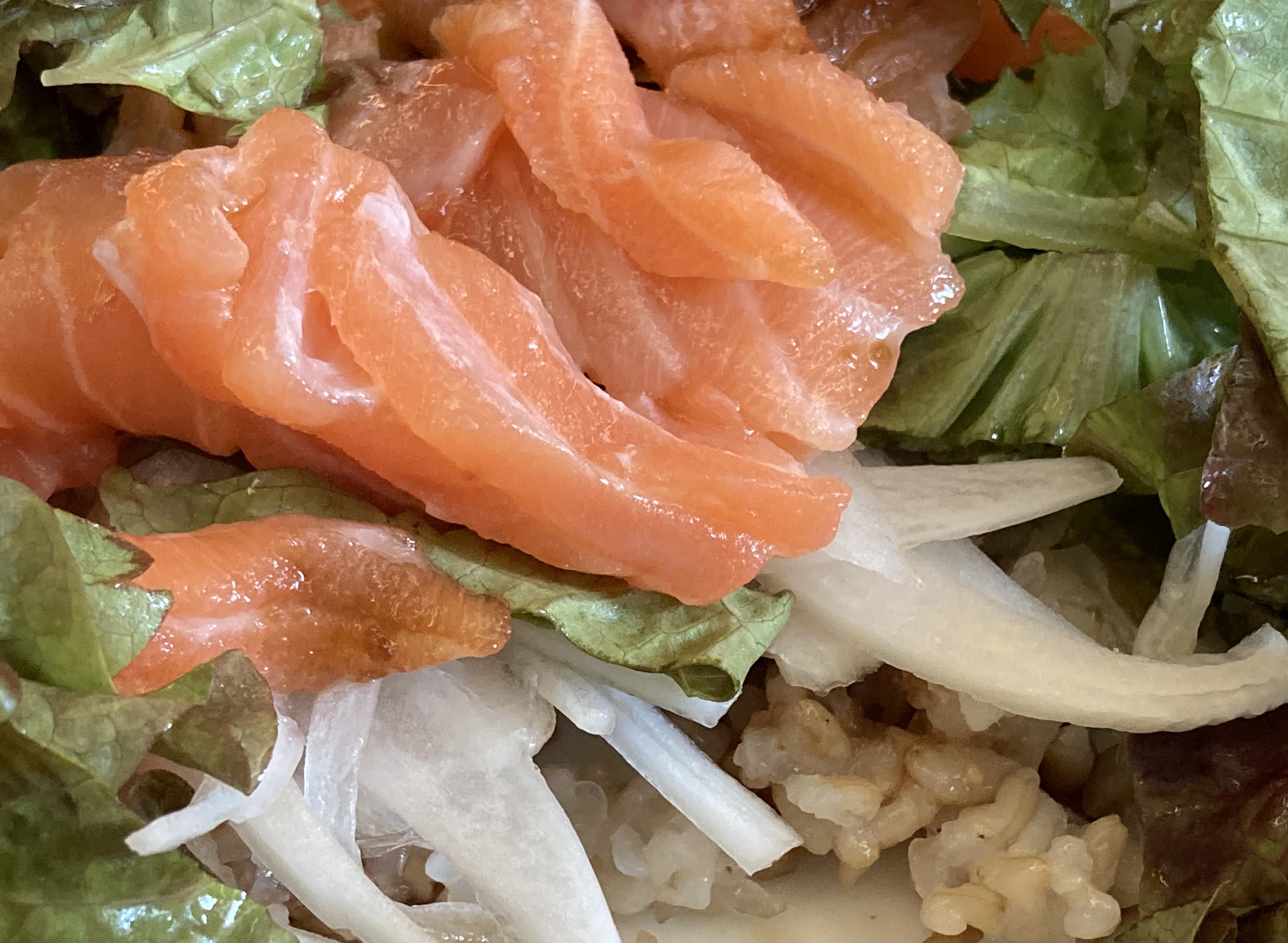 곤약현미밥 반 + 양파 + 상추 + 연어 + 돈부리 소스