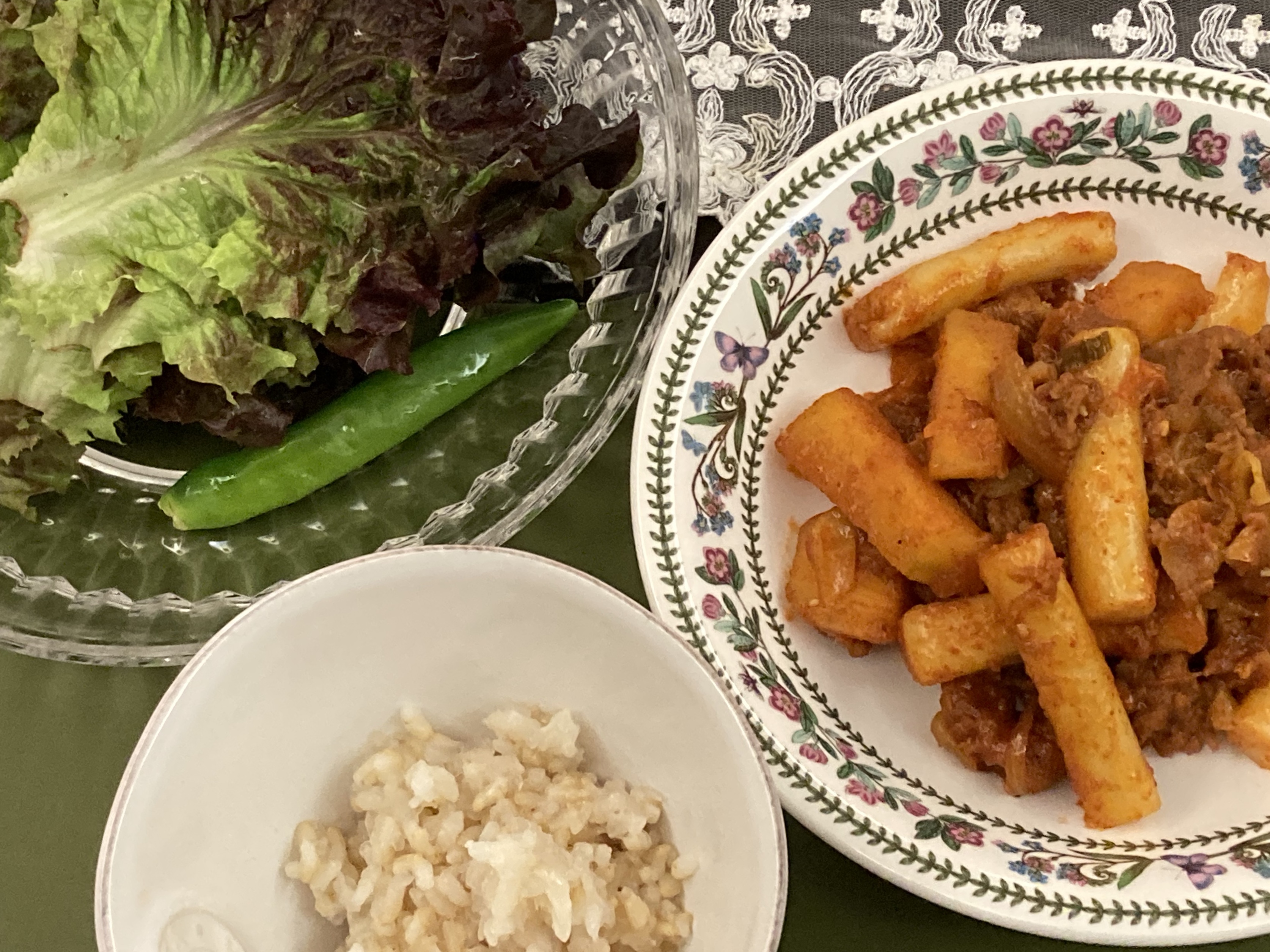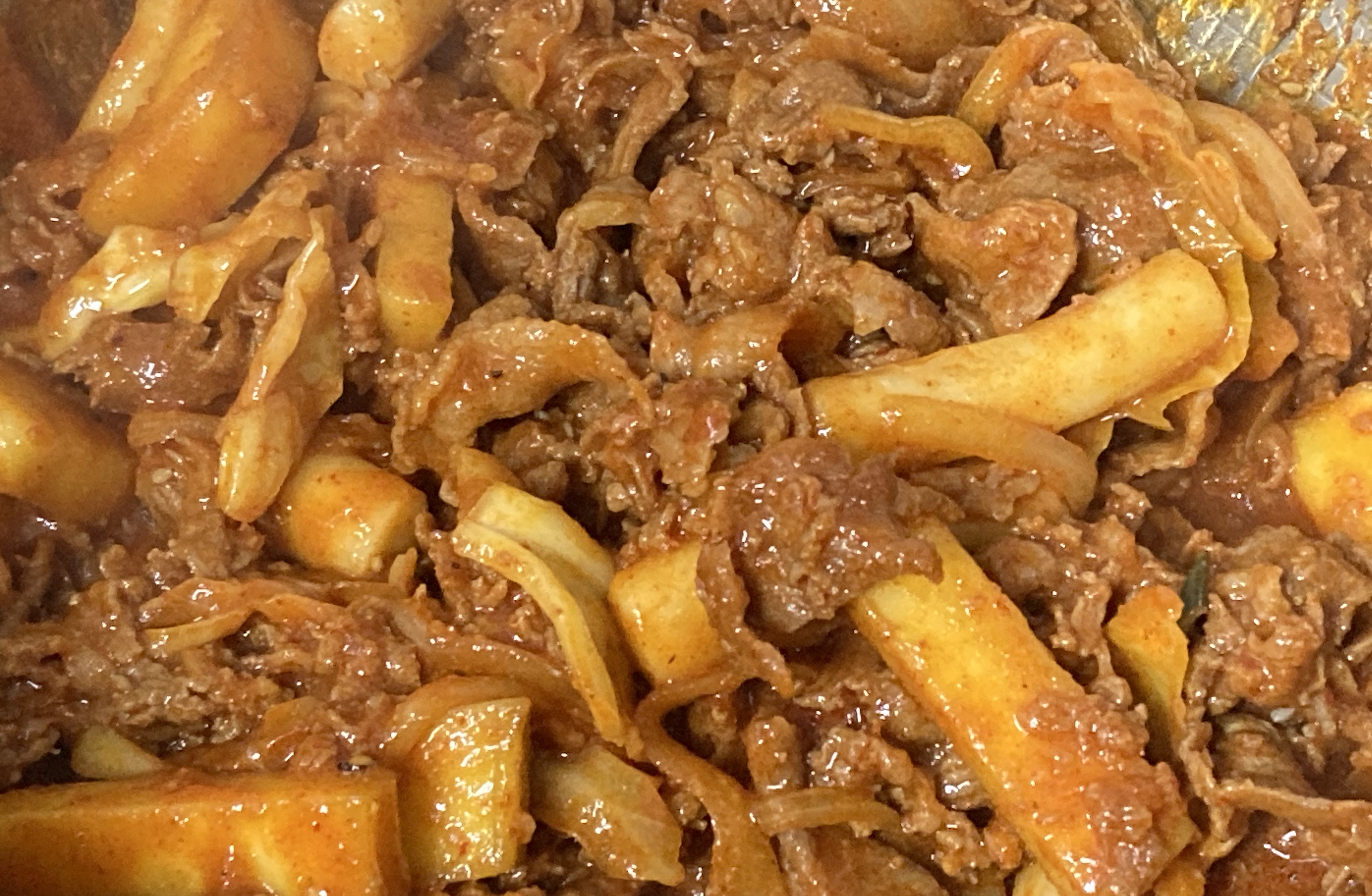 제육볶음에 고구마, 양배추, 양파, 떡 이것저것 넣었다.