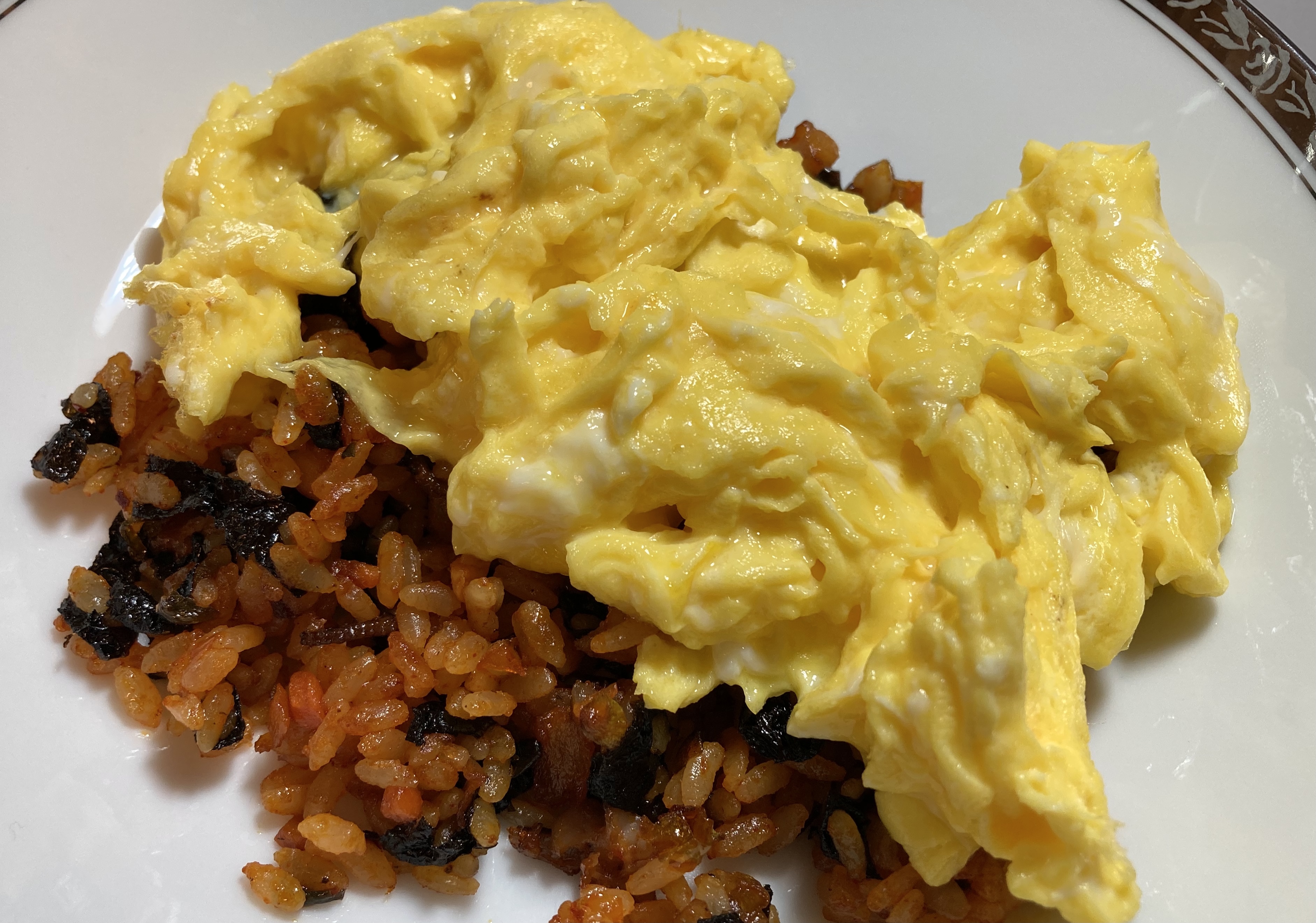 점심은 김과 불닭볶음면 소스를 넣고 볶은 냉동 낙지볶음밥과 스크램블.