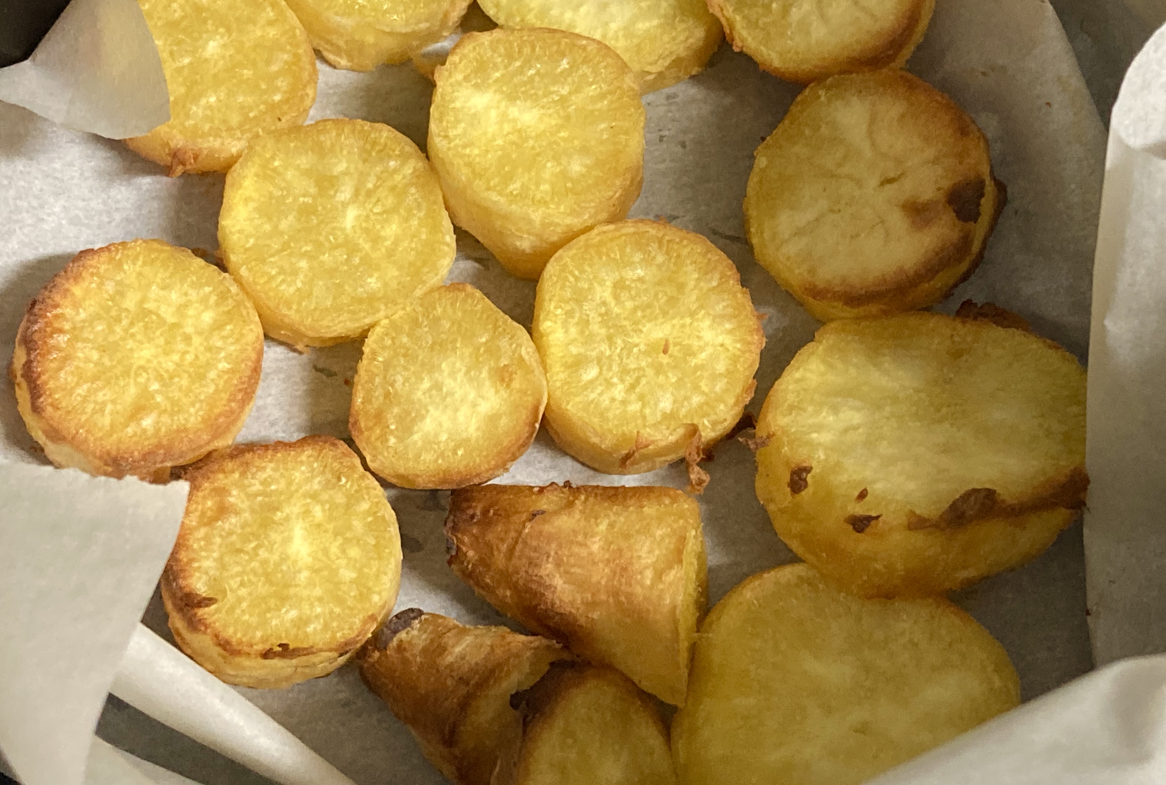 껍질을 벗기고 먹기 좋게 잘라 에어프라이에 구웠다.