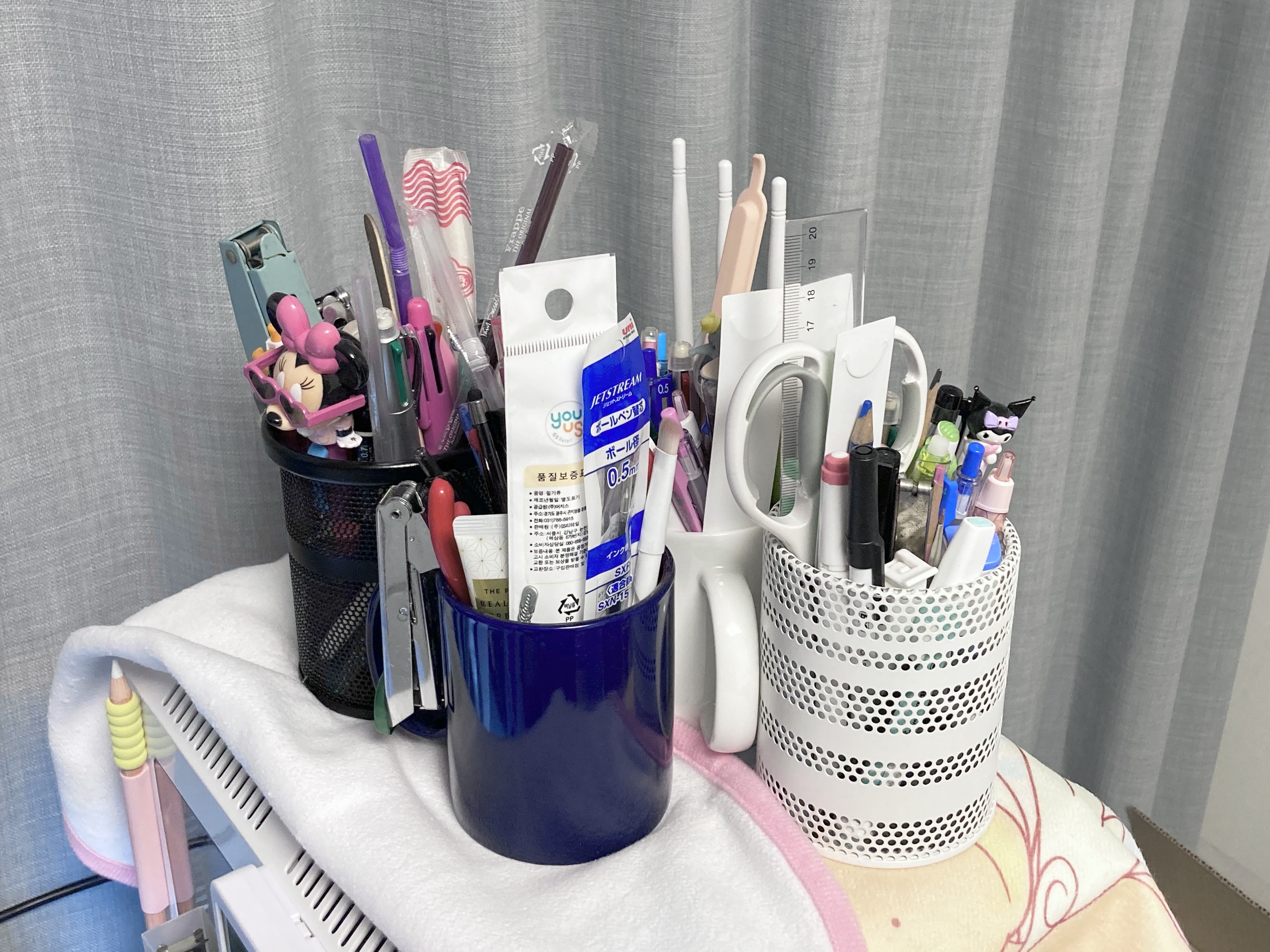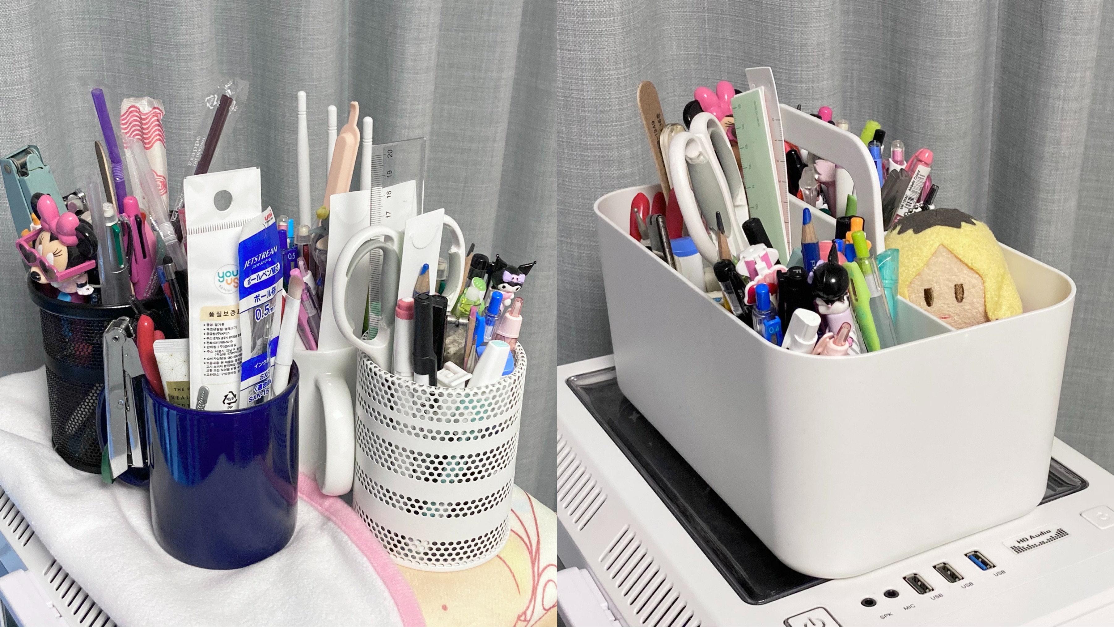 여러 가지 컵에 필기류, 공구, 잡동사니들을 뒤죽박죽 넣어놨다.